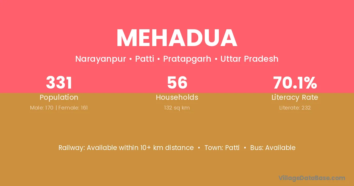 Mehadua village has a total population of 331 people, of which 170 are males and 161 are females.
