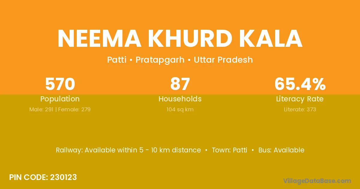 Neema Khurd Kala village has a total population of 570 people, of which 291 are males and 279 are females.
