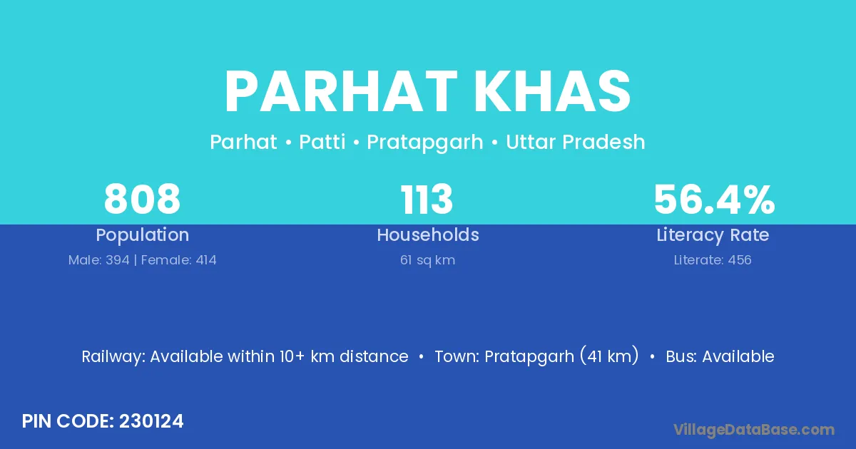 Pratapgarh (41 km) is the nearest town to Parhat Khas village for major economic activities and is located approximately 41 km away.
