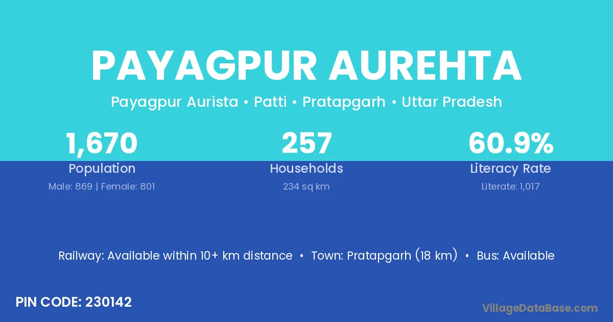 Payagpur Aurehta village has a total population of 1,670 people, of which 869 are males and 801 are females.