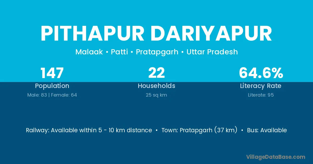 Pratapgarh (37 km) is the nearest town to Pithapur Dariyapur village for major economic activities and is located approximately 37 km away.