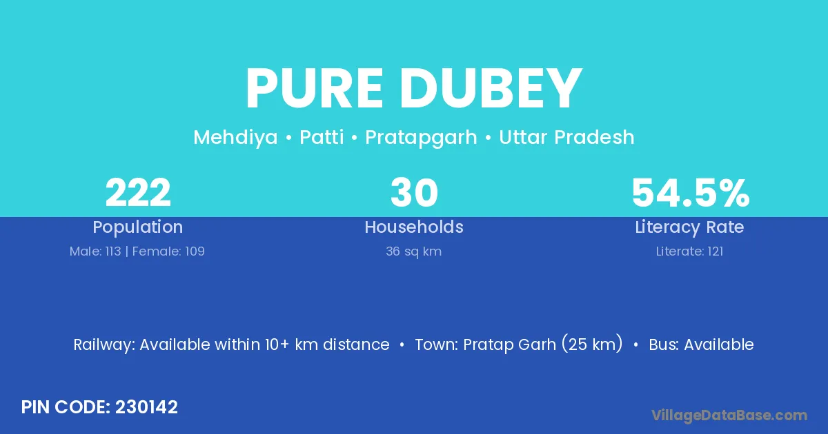 Pure Dubey village has a total population of 222 people, of which 113 are males and 109 are females.