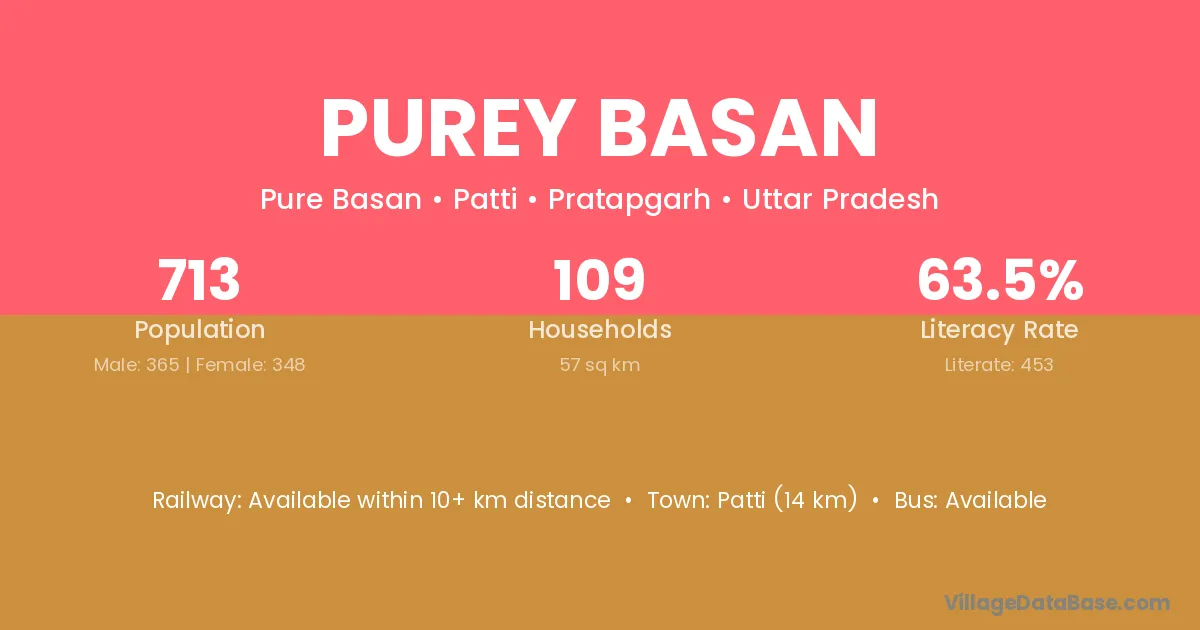 Purey Basan village has a total population of 713 people, of which 365 are males and 348 are females.