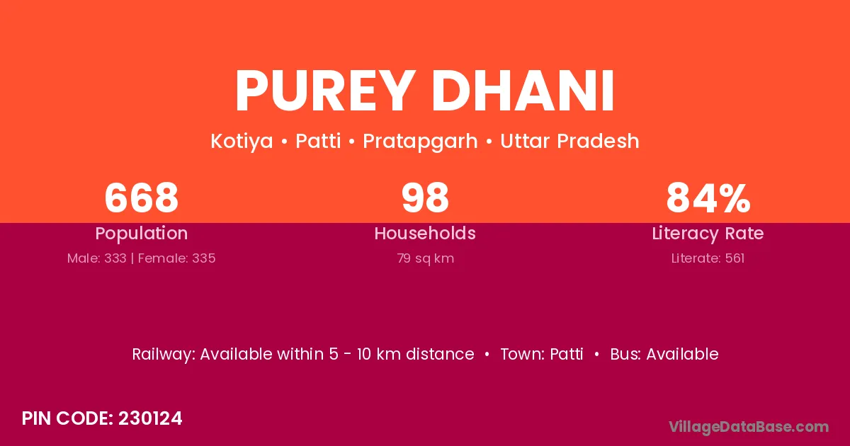 Purey Dhani village has a total population of 668 people, of which 333 are males and 335 are females.