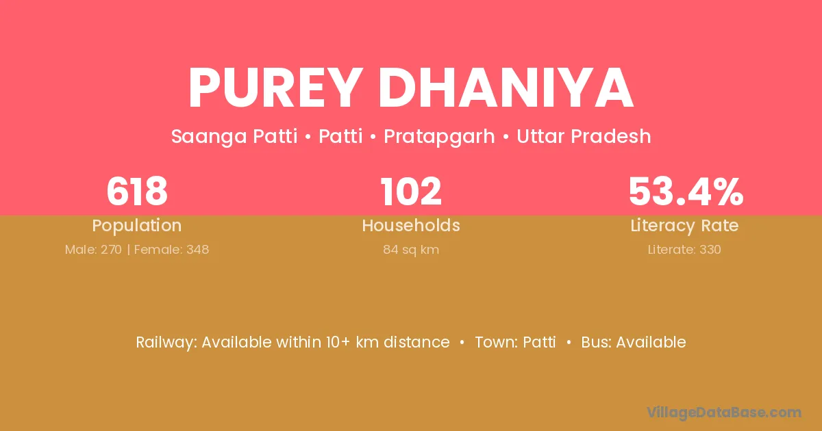 Purey Dhaniya village has a total population of 618 people, of which 270 are males and 348 are females.