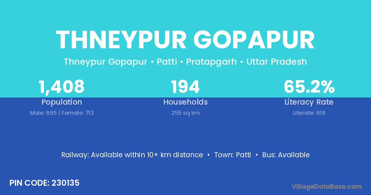 Thneypur Gopapur village has a total population of 1,408 people, of which 695 are males and 713 are females.