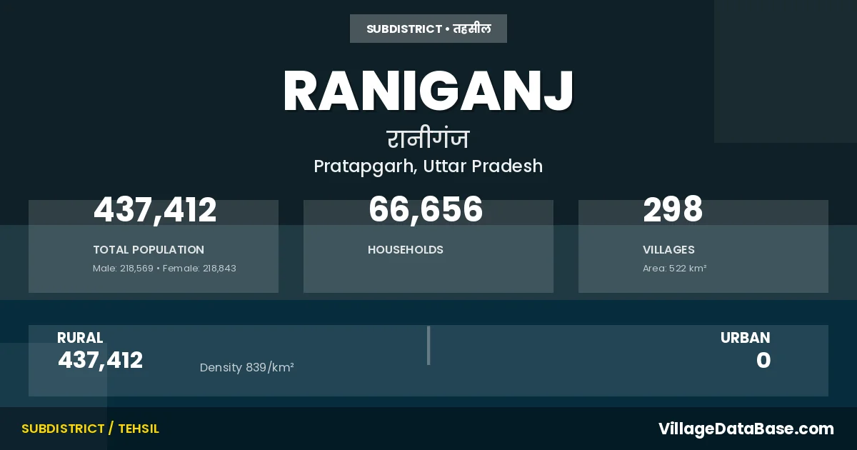 According to the 2011 census The total area of Raniganj Tehsil is 522 km², with a population of 437412 people. The population density is 839 inhabitants per square kilometre, and there are approximately 66656 houses in the sub district.