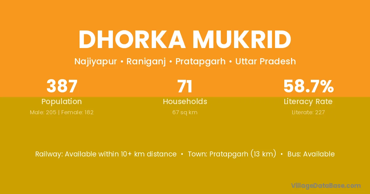 Pratapgarh (13 km) is the nearest town to Dhorka Mukrid village for major economic activities and is located approximately 13 km away.