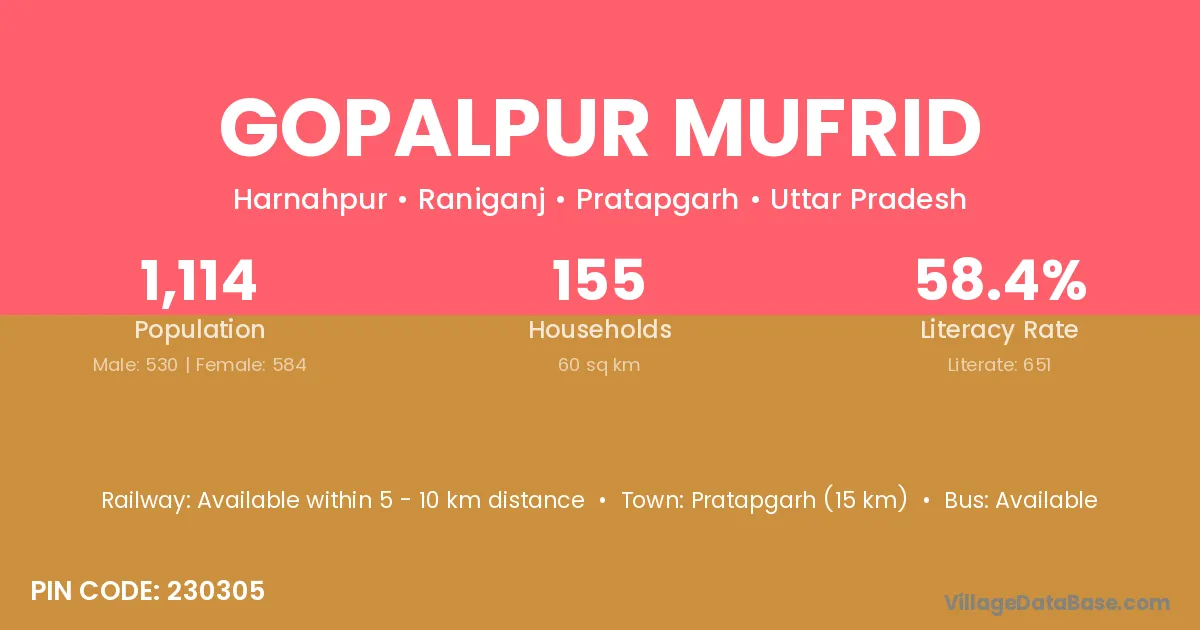 Pratapgarh (15 km) is the nearest town to Gopalpur Mufrid village for major economic activities and is located approximately 15 km away.