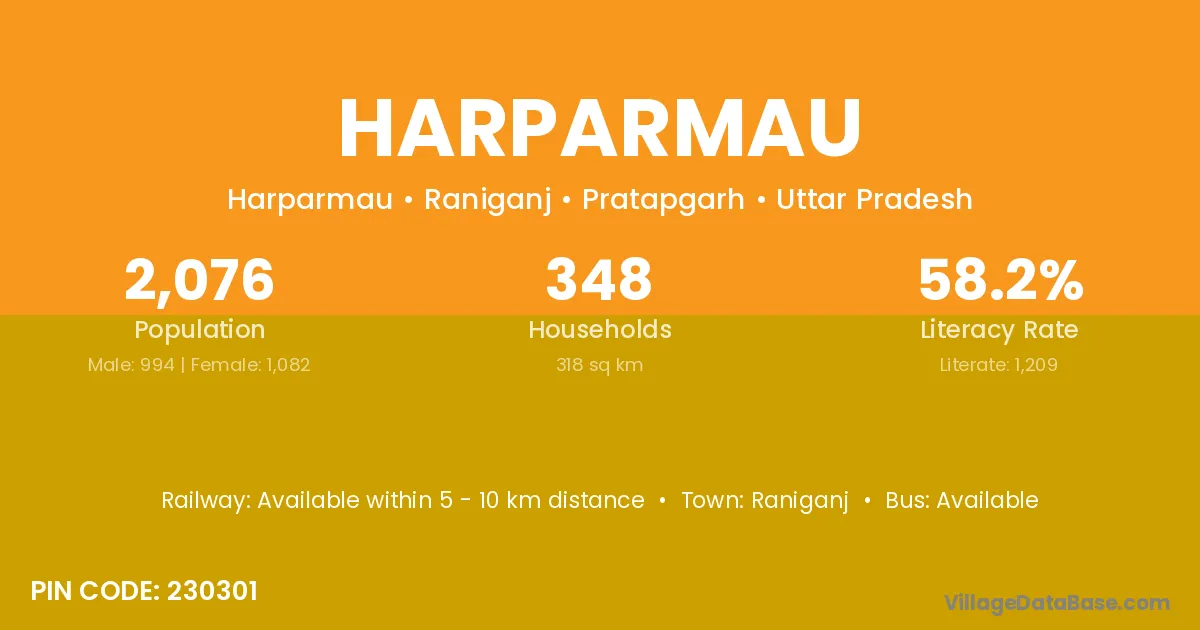 Harparmau village has a total population of 2,076 people, of which 994 are males and 1,082 are females.