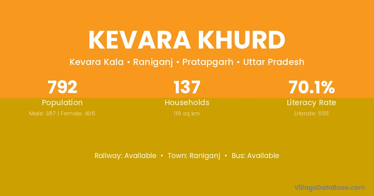 Kevara Khurd village has a total population of 792 people, of which 387 are males and 405 are females.