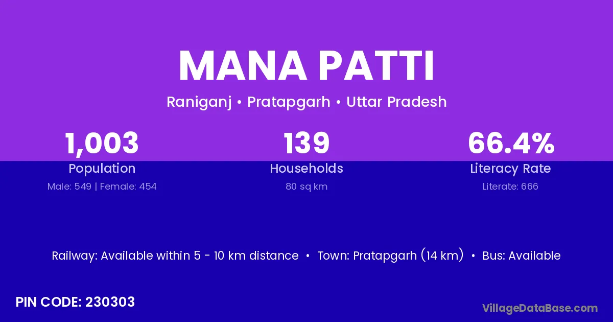 Pratapgarh (14 km) is the nearest town to Mana Patti village for major economic activities and is located approximately 14 km away.