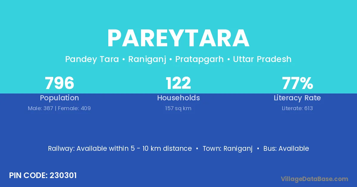 Pareytara village has a total population of 796 people, of which 387 are males and 409 are females.
