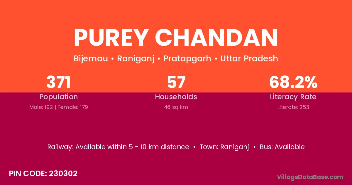Purey Chandan village has a total population of 371 people, of which 192 are males and 179 are females.
