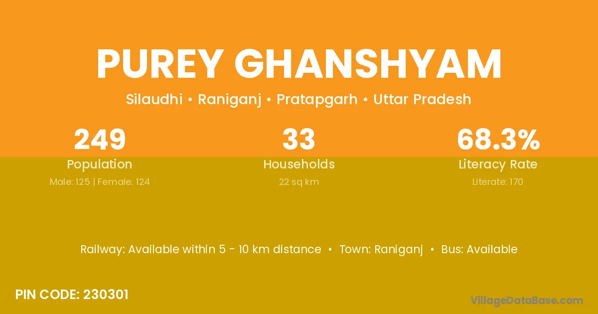 Purey Ghanshyam village has a total population of 249 people, of which 125 are males and 124 are females.