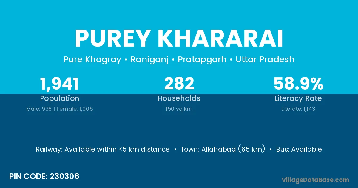Allahabad (65 km) is the nearest town to Purey Khararai village for major economic activities and is located approximately 65 km away.