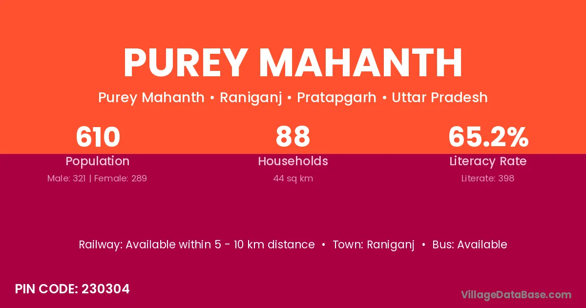 Purey Mahanth village has a total population of 610 people, of which 321 are males and 289 are females.