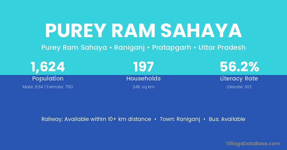 Purey Ram Sahaya village has a total population of 1,624 people, of which 834 are males and 790 are females.
