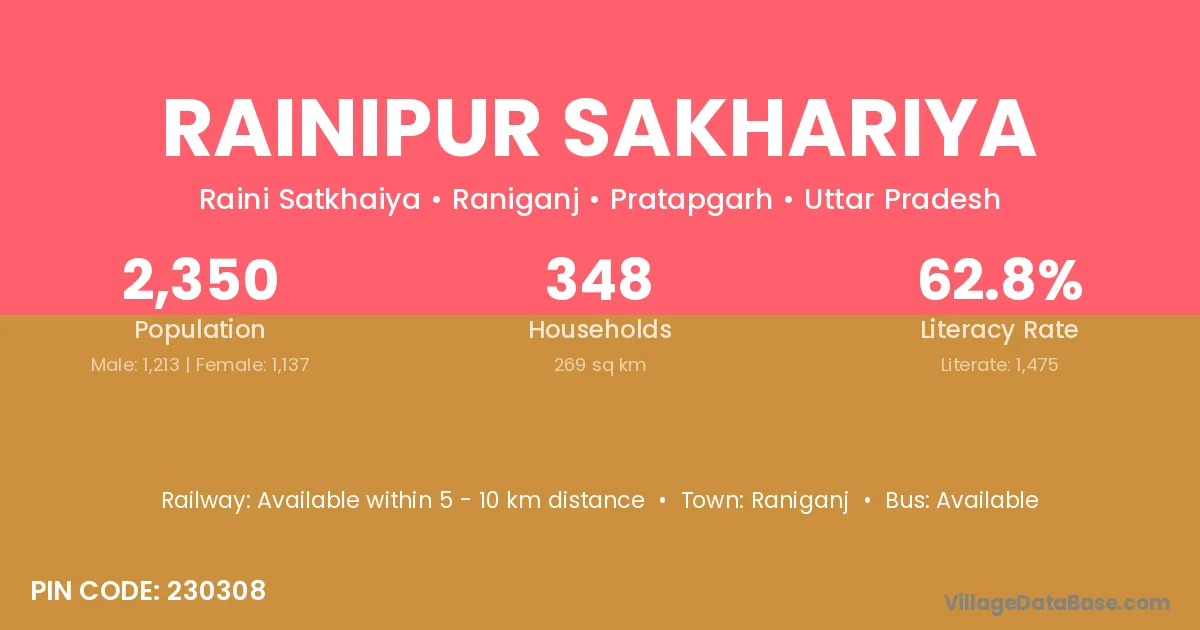 Rainipur Sakhariya village has a total population of 2,350 people, of which 1,213 are males and 1,137 are females.