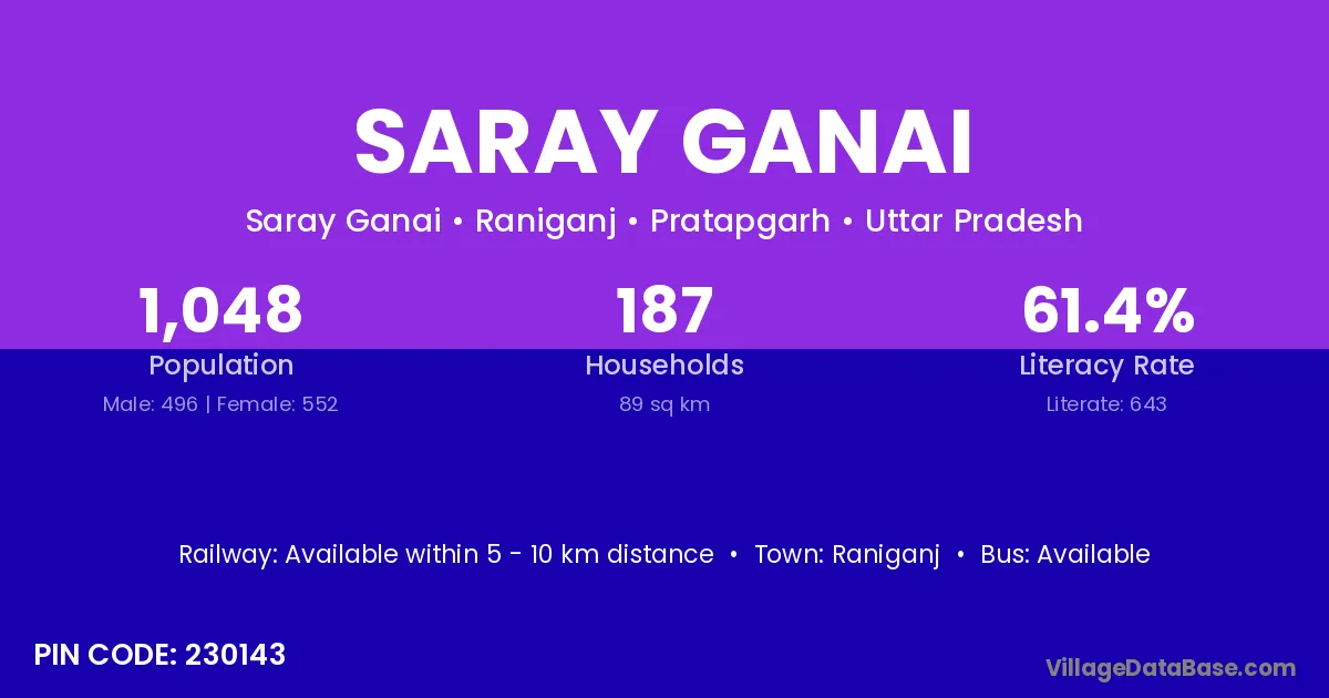 Saray Ganai village has a total population of 1,048 people, of which 496 are males and 552 are females.