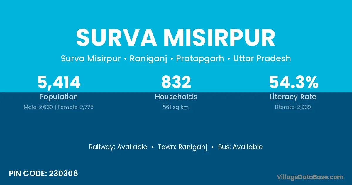 Surva Misirpur village has a total population of 5,414 people, of which 2,639 are males and 2,775 are females.