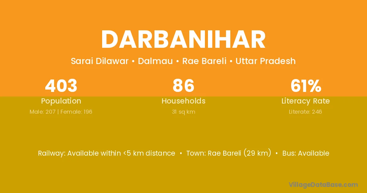 Rae Bareli (29 km) is the nearest town to Darbanihar village for major economic activities and is located approximately 29 km away.