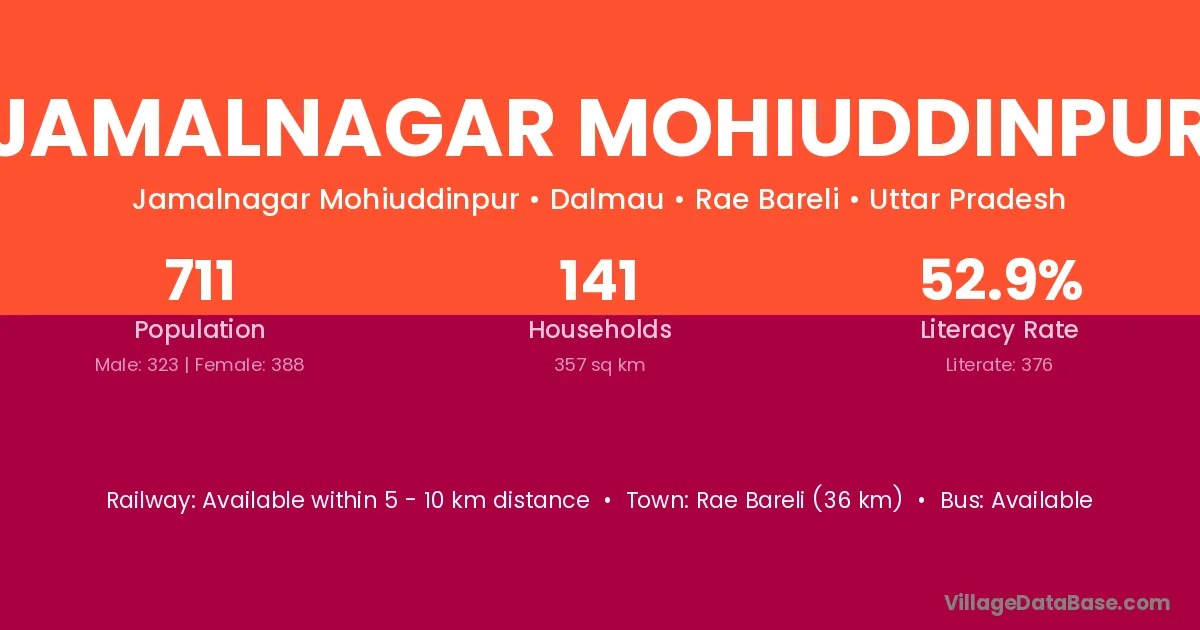 Jamalnagar Mohiuddinpur village has a total population of 711 people, of which 323 are males and 388 are females.