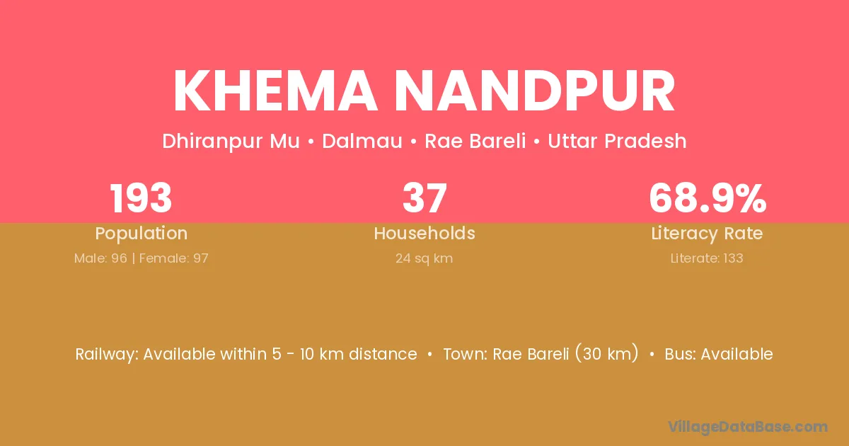 Rae Bareli (30 km) is the nearest town to Khema Nandpur village for major economic activities and is located approximately 30 km away.