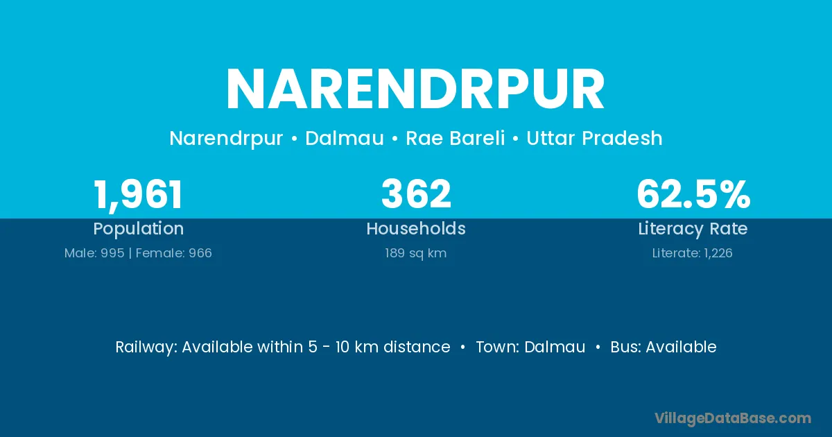 Narendrpur village has a total population of 1,961 people, of which 995 are males and 966 are females.