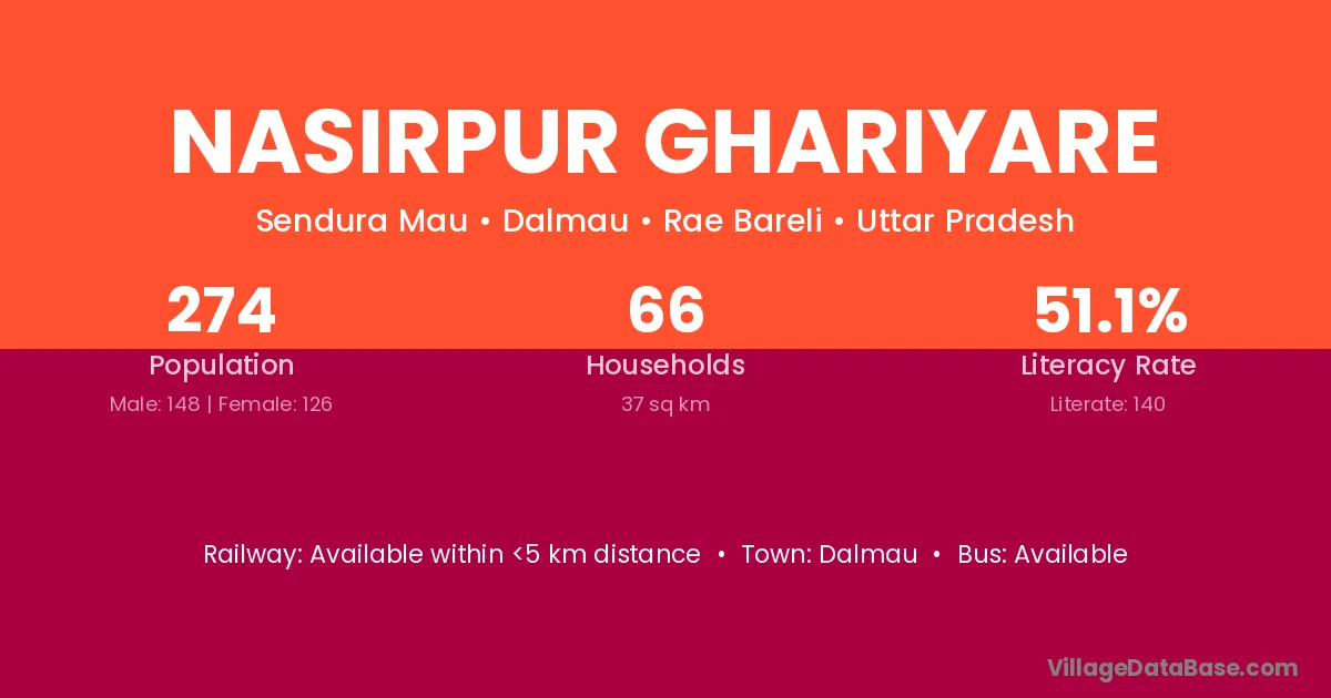 Nasirpur Ghariyare village has a total population of 274 people, of which 148 are males and 126 are females.