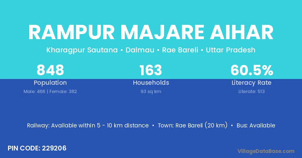 Rae Bareli (20 km) is the nearest town to Rampur Majare Aihar village for major economic activities and is located approximately 20 km away.