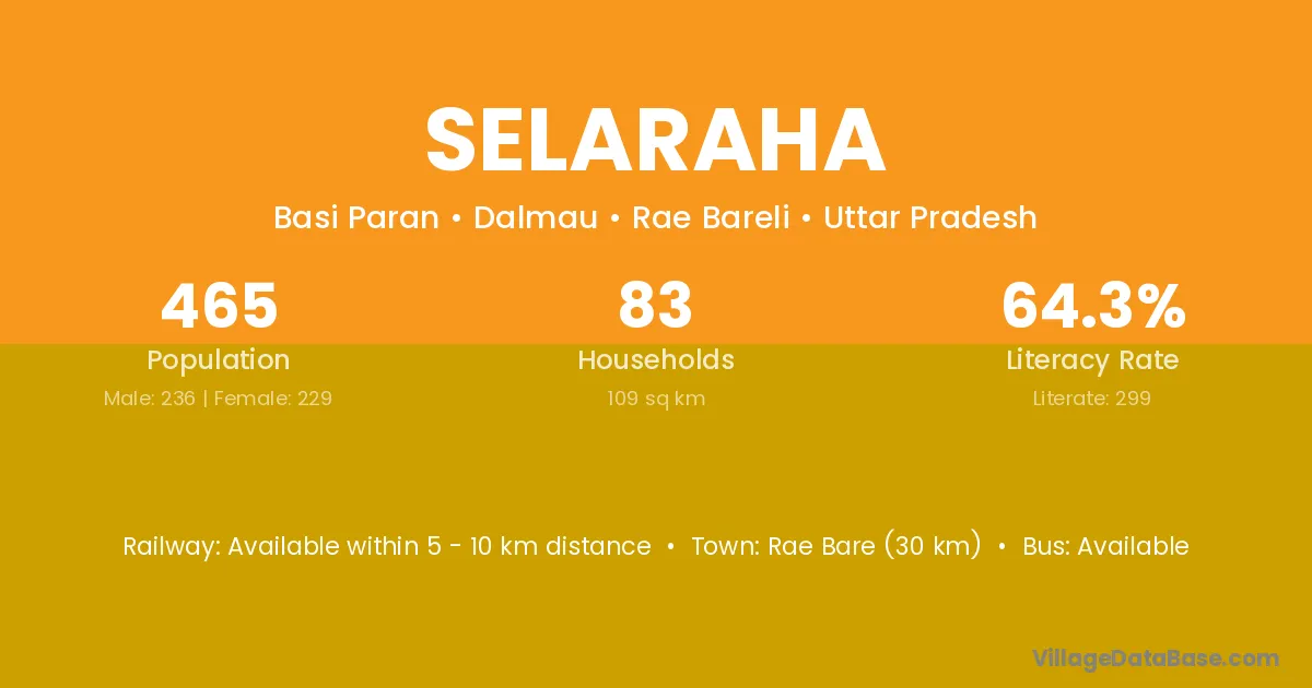 Rae Bare (30 km) is the nearest town to Selaraha village for major economic activities and is located approximately 30 km away.