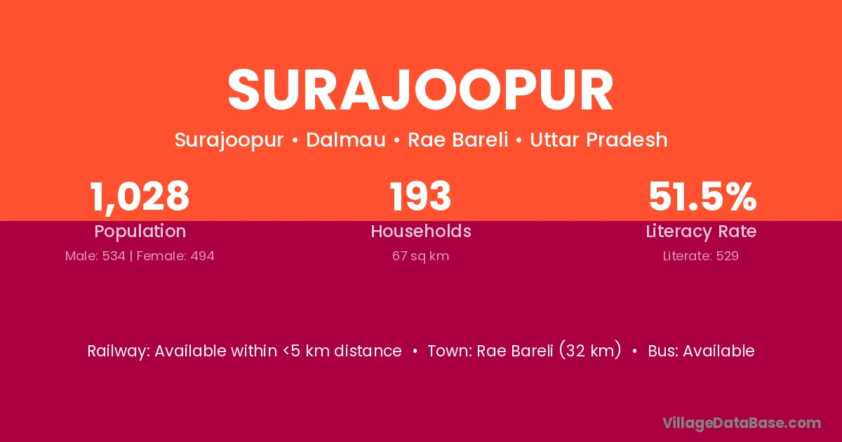 Rae Bareli (32 km) is the nearest town to Surajoopur village for major economic activities and is located approximately 32 km away.
