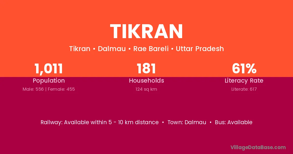Tikran village has a total population of 1,011 people, of which 556 are males and 455 are females.