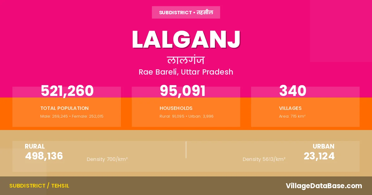 According to the 2011 census The total area of Lalganj Tehsil is 715 km², with a population of 521260 people. The population density is 729 inhabitants per square kilometre, and there are approximately 95091 houses in the sub district.