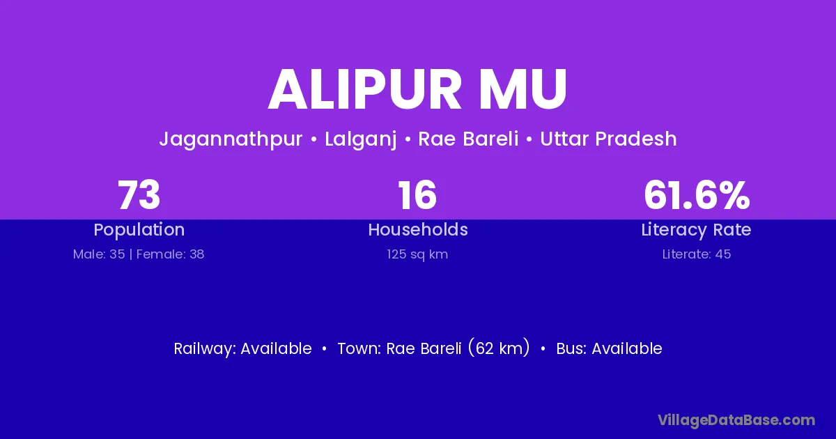 Rae Bareli (62 km) is the nearest town to Alipur Mu village for major economic activities and is located approximately 62 km away.