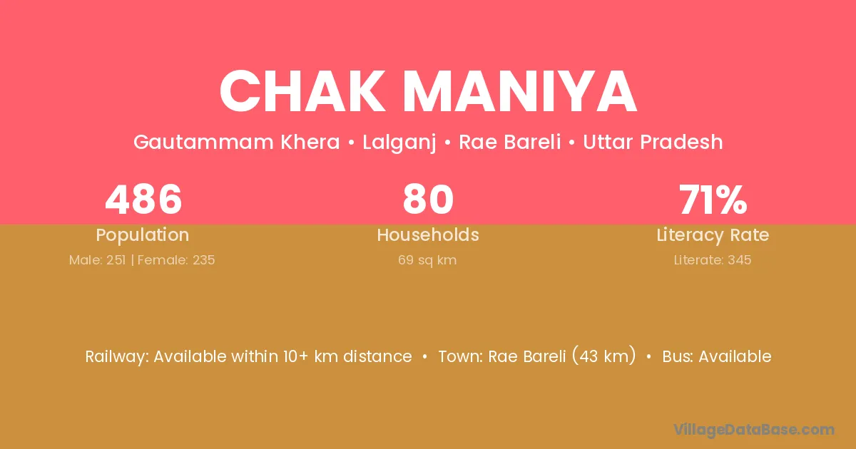 Rae Bareli (43 km) is the nearest town to Chak Maniya village for major economic activities and is located approximately 43 km away.