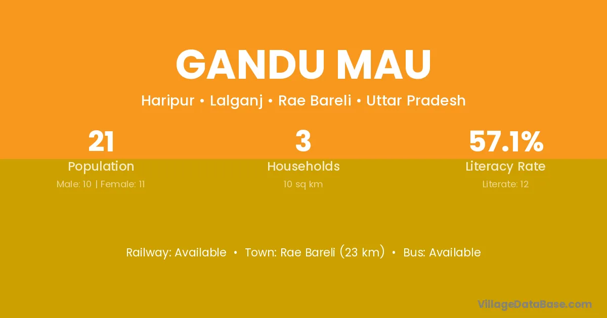 Rae Bareli (23 km) is the nearest town to Gandu Mau village for major economic activities and is located approximately 23 km away.