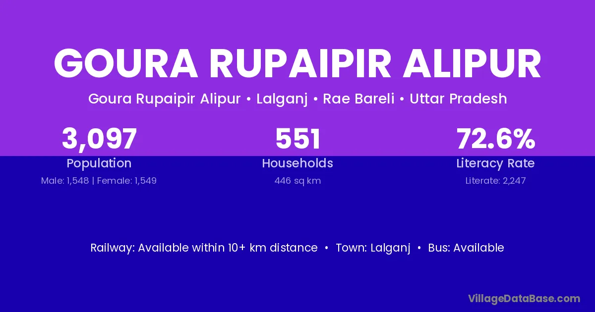 Goura Rupaipir Alipur village has a total population of 3,097 people, of which 1,548 are males and 1,549 are females.