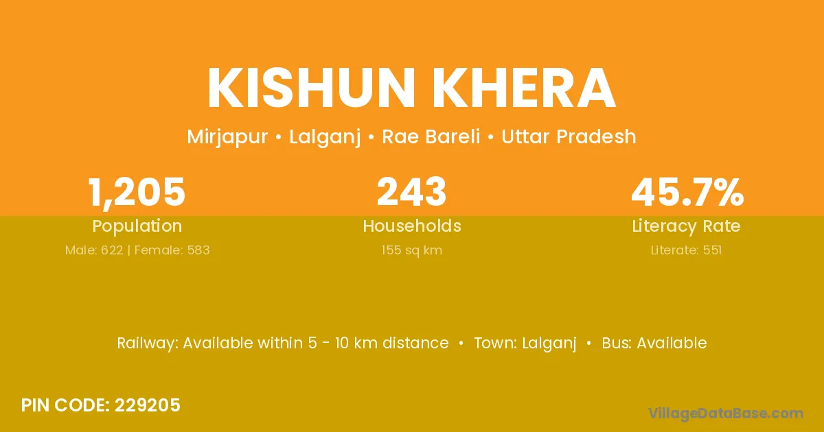 Kishun Khera village has a total population of 1,205 people, of which 622 are males and 583 are females.