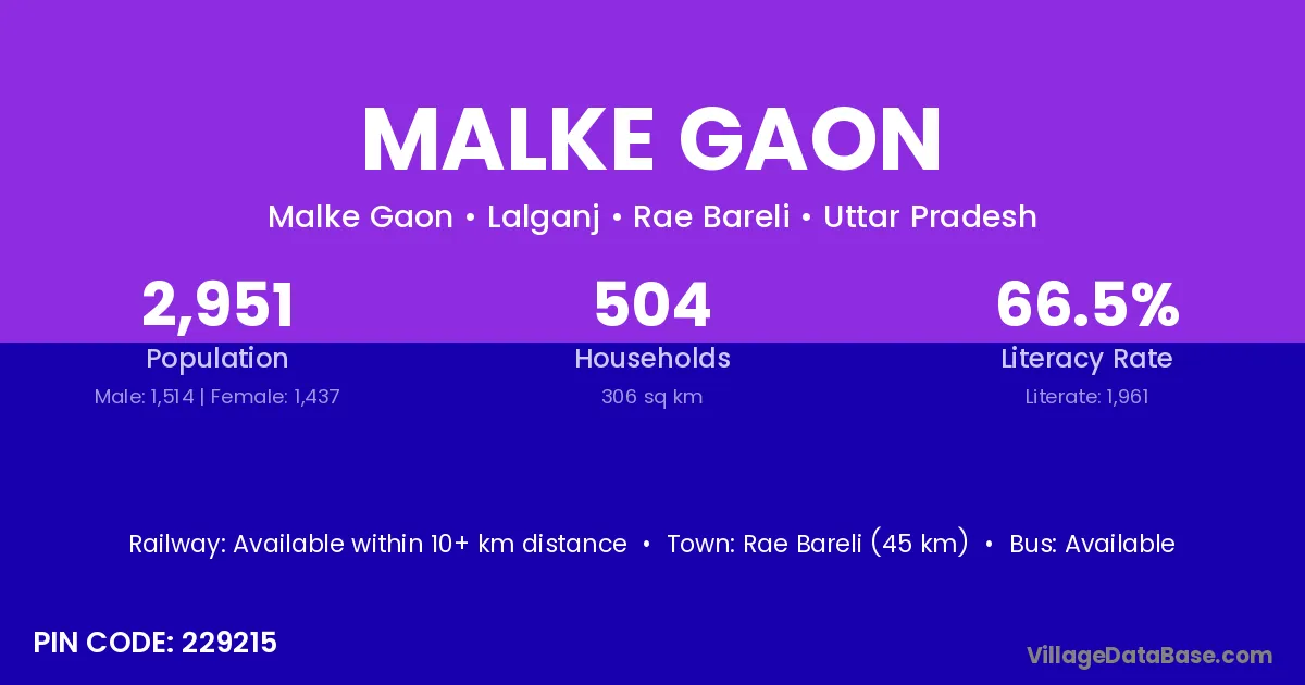 Rae Bareli (45 km) is the nearest town to Malke Gaon village for major economic activities and is located approximately 45 km away.