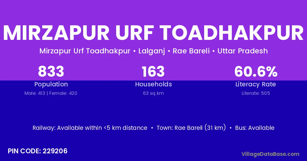 Mirzapur Urf Toadhakpur village has a total population of 833 people, of which 413 are males and 420 are females.