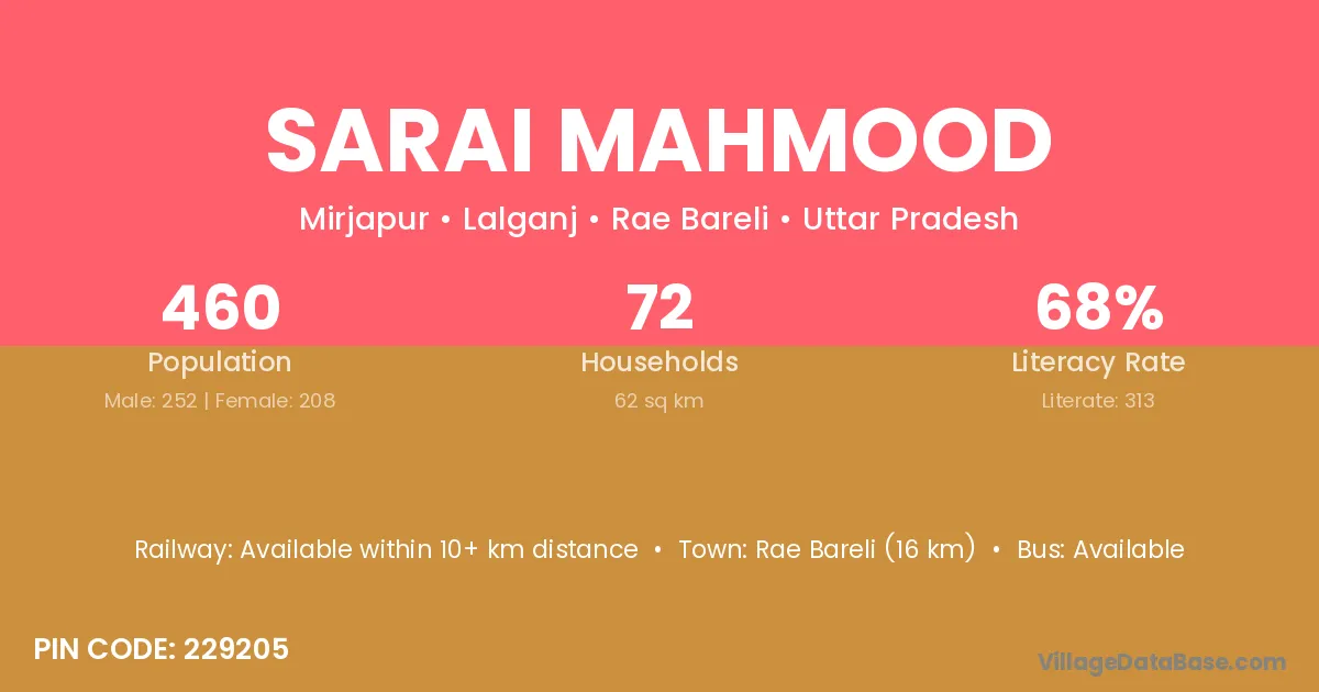 Rae Bareli (16 km) is the nearest town to Sarai Mahmood village for major economic activities and is located approximately 16 km away.