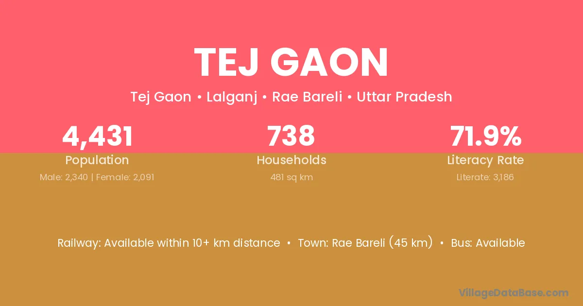 Rae Bareli (45 km) is the nearest town to Tej Gaon village for major economic activities and is located approximately 45 km away.