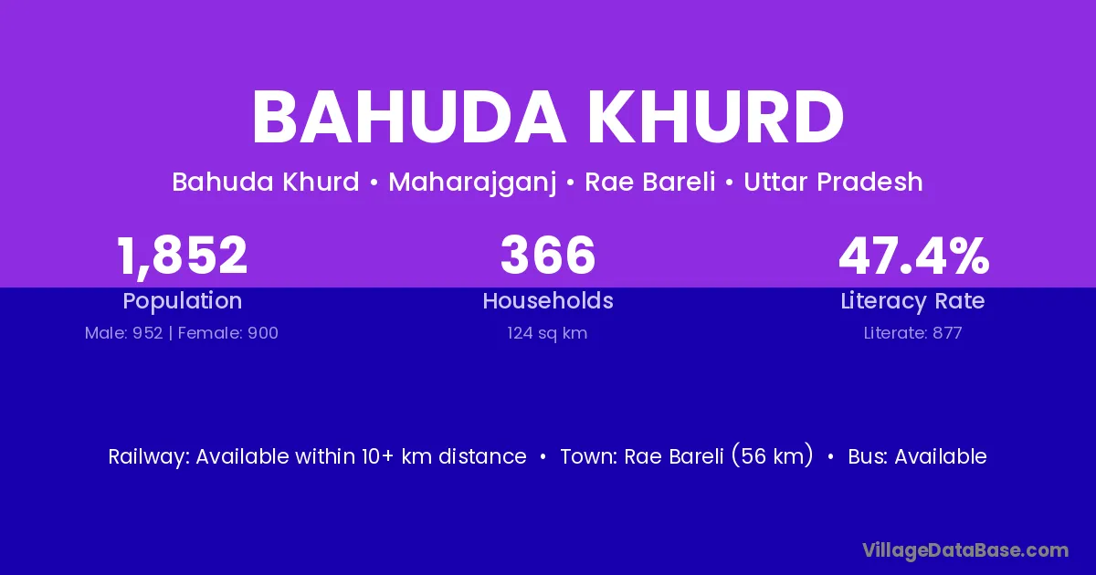 Rae Bareli (56 km) is the nearest town to Bahuda Khurd village for major economic activities and is located approximately 56 km away.