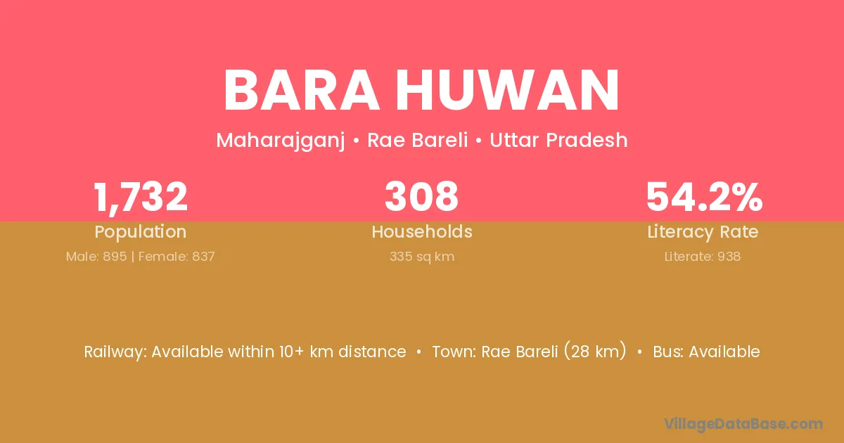 Rae Bareli (28 km) is the nearest town to Bara Huwan village for major economic activities and is located approximately 28 km away.