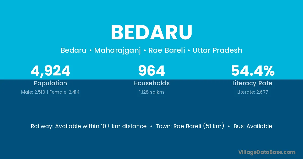 Rae Bareli (51 km) is the nearest town to Bedaru village for major economic activities and is located approximately 51 km away.