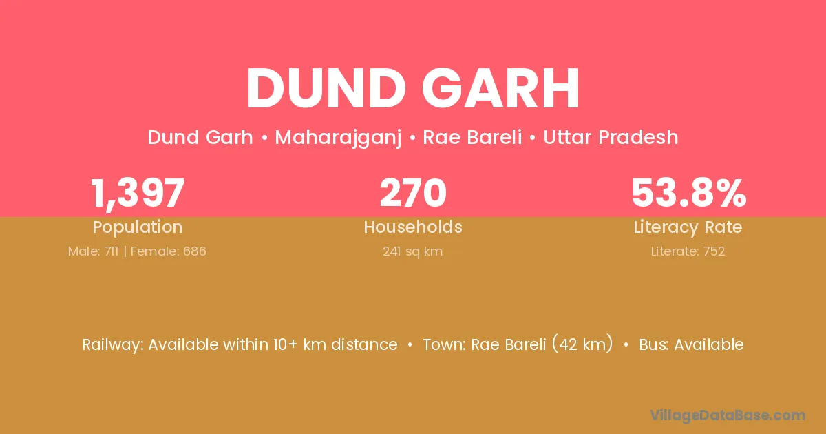 Rae Bareli (42 km) is the nearest town to Dund Garh village for major economic activities and is located approximately 42 km away.