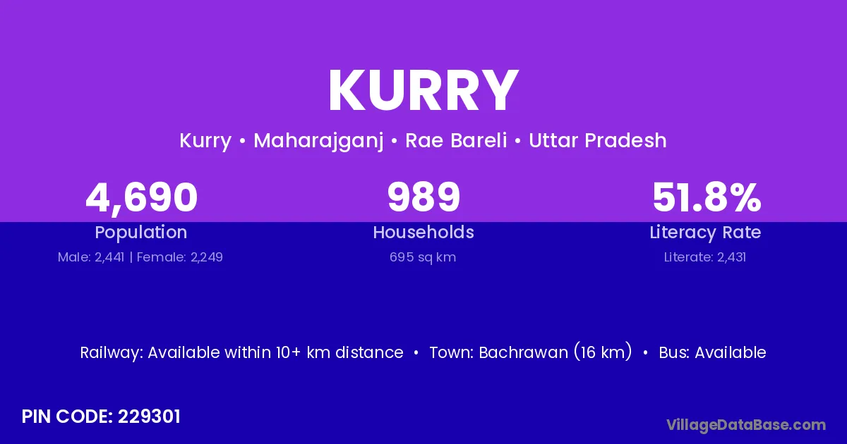 Bachrawan (16 km) is the nearest town to Kurry village for major economic activities and is located approximately 16 km away.