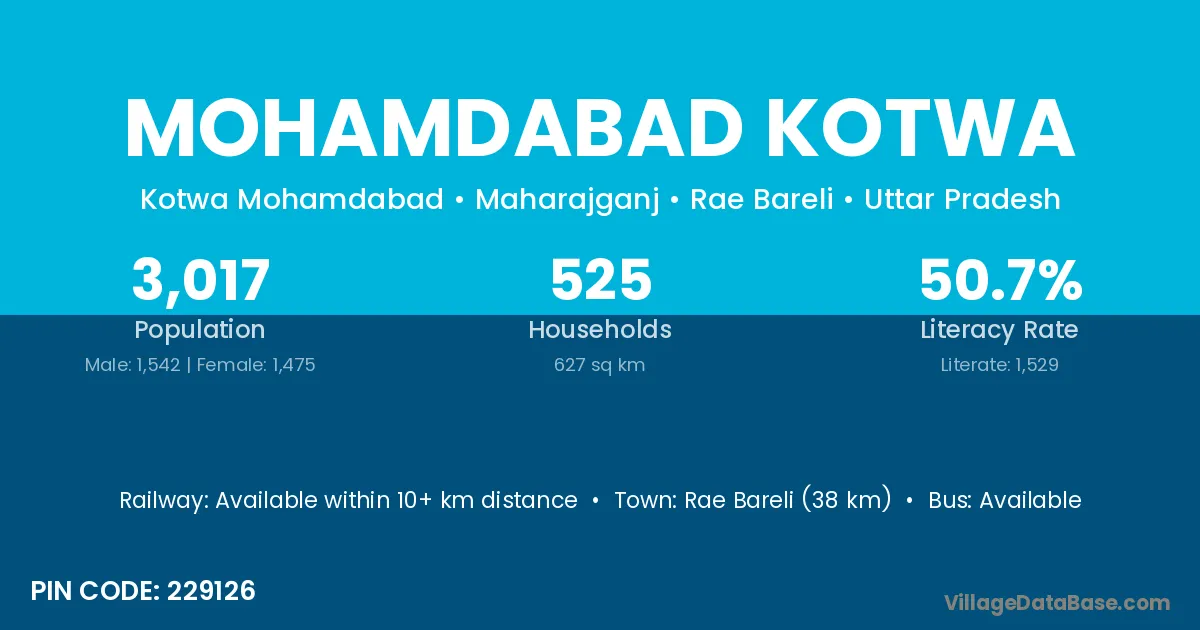 Rae Bareli (38 km) is the nearest town to Mohamdabad Kotwa village for major economic activities and is located approximately 38 km away.